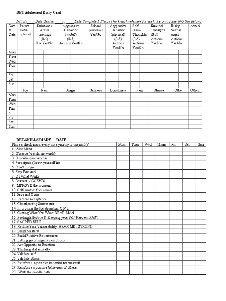 Instructions for therapists and clients • initials/id # : The front half is used in. The entire back half of the card is used in skills training sessions; How to complete the diary card: Dbt skills used fill in the number for the degree to which you used the skill.